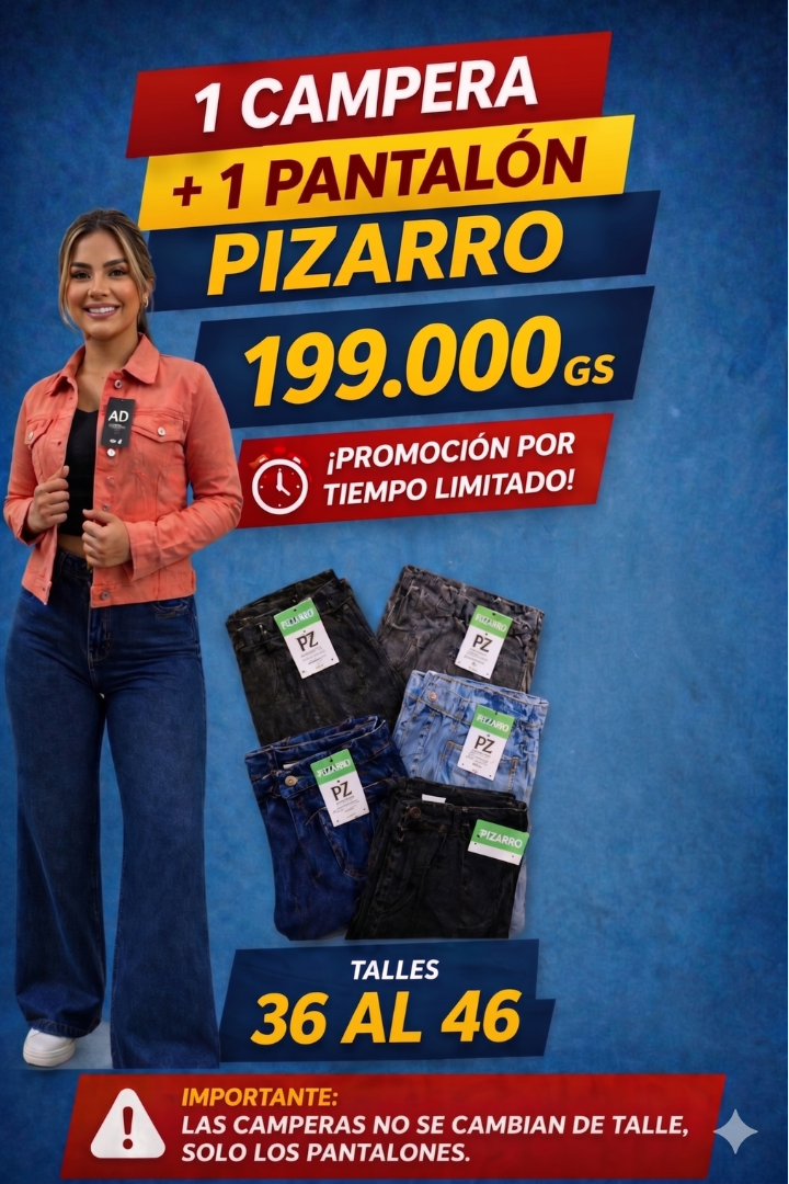 ¡Renová tu outfit con la mejor relación calidad-precio de Paraguay! En Jeans Pizarro, entendemos que buscás prendas duraderas, con calce perfecto y un estilo que se adapte a tu ritmo diario. Por eso, te presentamos nuestro Combo Promocional: llevate una campera de temporada y un pantalón de calce premium por un precio increíble.
